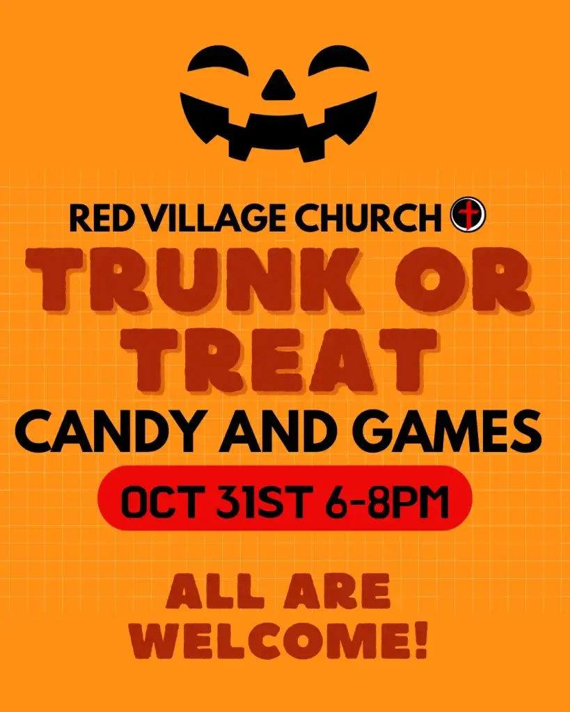Come to our Trunk or Treat event on Halloween day (Oct 31st) from 6-8pm for candy and games for all who stop by! We will have decorated trunks with candy along with special games where kids have the chance to win king size candy bars!! This will be in the parking lot of Red Village Church. Hope you can come by!